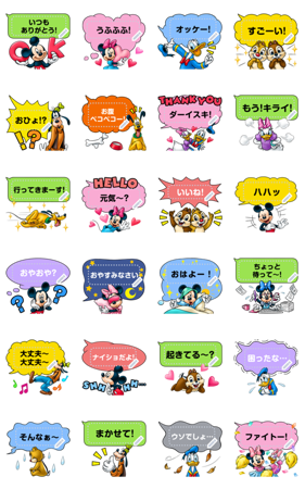 吹き出し型になっており、特にこのスタンプを送られた側は普段のメッセージをもらった際と変わらないトーク構成となるので、とても面白い。そして、その吹き出しの周りにはミッキーなどがいることで尚のこと、面白い要素が加わるであろう。