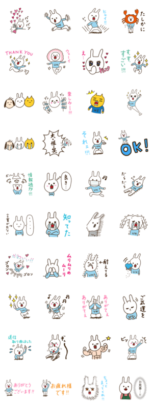 ウサギのウーのたのしく使えるイェーイなスタンプ!ウキウキっと使いやすい!出演:ネコのネー/イヌのイー/くちびるさん/すあま及びカニのかぶりものをしたウーNIKUQ WORKS より発売