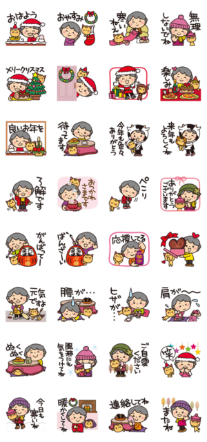 優しくてキュートな「ばぁば」のスタンプ。日常使いのほか、クリスマスや年末のご挨拶、受験等の応援、バレンタインにも大活躍の冬バージョンです。Reiko より発売