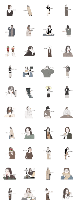 秋冬ver。トレンドファッション、ヘア、メイクを取り入れた日常で使えるスタンプです。ネイルも可愛くなっているのでぜひ見てください。