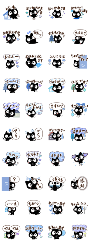 『クロネコすたんぷ』の『冬・北欧風』編の第二弾。黒猫が北欧風の冬の飾りと一緒に返事をします。毎日使える便利なスタンプです。くろねこ好きな方にぜひ。【かたこ】