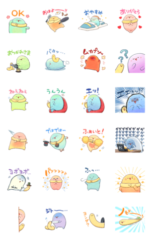 いつもにこやかカラフルな謎生物ラムネちゃん&気付けば側にいる謎生物ノビーンのスタンプですあきの より発売