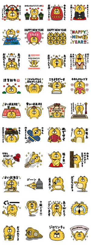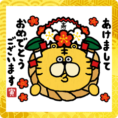 【あけおめスタンプ】ゆるいトラのあけおめスタンプです。年末年始、お正月、年賀状、新年の挨拶などにお使いください。green peas より発売