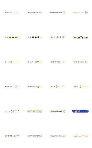 誕生日・ハロウィン・クリスマス・年末年始・お正月に。大人女子にぴったり♪シンプルな動く絵文字吹き出し。横長で小さいスタンプです。おめでとうにも日常の返事にも。