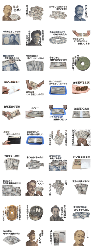 お正月、年末年始に使えるお金のスタンプです!お年玉としてお金のスタンプを送りまくろう!現金、札束、偉人、大晦日、元日、元旦。あけましておめでとうございます!
