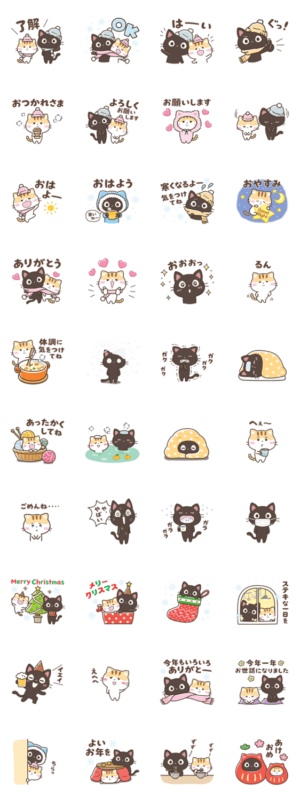 黒猫のクロと三毛猫のミケの、いつもより少しゆるっと可愛い冬スタンプです。タナアキ より発売