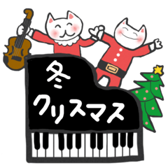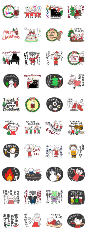 冬、クリスマス、年末、お正月に使えるスタンプです。バイオリンやピアノ、ウクレレ、音楽のスタンプ入り。寒い冬の日に使える動物、小人、ジンジャーブレッドマン♪まりっきー より発売
