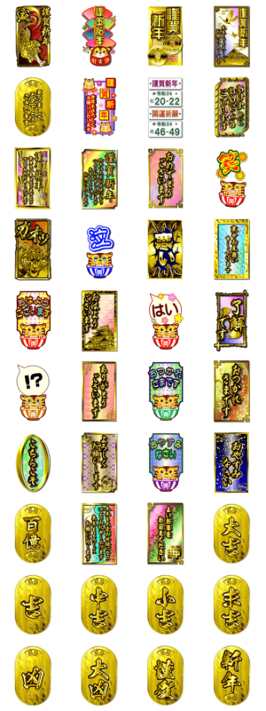 恒例期間限定販売年賀のビッグスタンプ版です謹賀新年など年末年始の挨拶中心に金ぴかゴールド大判小判寅キャラにおみくじなど令和四年の年明け開運にピッタリのスタンプ集