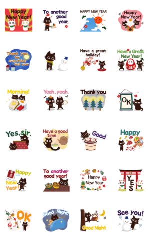 毎年使える!ナチュラルで絵本のようなねこのスタンプ3年末年始:英語Ver。年末年始のあいさつを楽しくしよう!和風で女子力高めな大人可愛い女子向け。門松,招き猫,雪だるまmugiko より発売