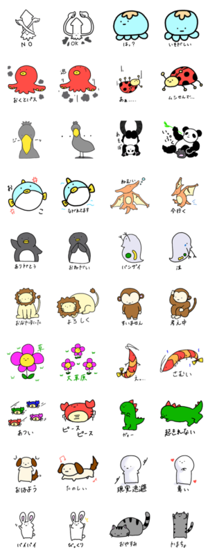なんとも言えない生き物たちが代わりに返答してくれるスタンプです。四季 夕 より発売