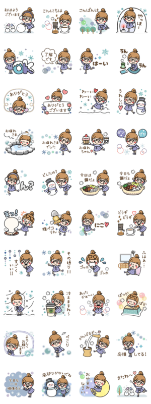おだんごガールがメガネをかけて登場★冬バージョンで毎日使えるスタンプが盛り沢山。大人*かわいい*可愛い*女の子*おだんご*使いやすい*おしゃれ遠藤まめこ より発売
