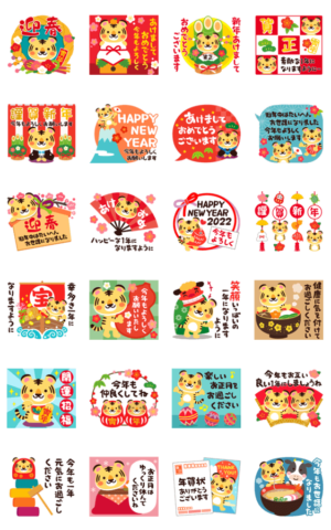 画面いっぱいに飛び出す、2022年寅年にぴったりのおめでたいお正月スタンプ。ちょっとだけ大人の子供すぎない柄が使いやすい‼年末年始のご挨拶に大活躍です♪みーすけ より発売