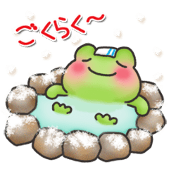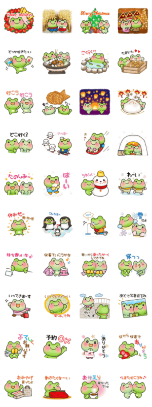 かえるちゃんシリーズ、冬に使えるお出かけスタンプです。イルミネーションキラキラのクリスマス、雪遊びに温泉にいっぱい出かけたーい!