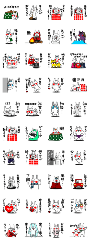 うさぎのまったりしたお正月スタンプです。種類が豊富で使いやすいですね。