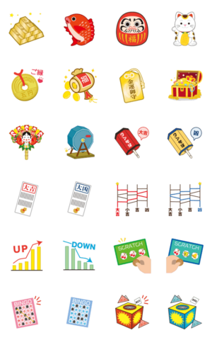 便利なお金に関する絵文字です。小判、鯛、ダルマ、招き猫、五円玉(ご縁)、金運お守り、宝箱、おみくじ、あみだくじ、ビンゴ、抽選箱、スクラッチなど