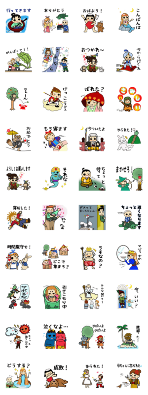 有名な童話をモチーフにしたスタンプです。 日常で使えるひと言付き。 ・アラジン ・シンデレラ ・浦島太郎・花さかじいさん・泣いた赤鬼・人魚姫・鶴の恩返しなど