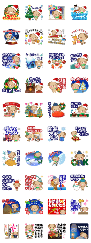 子犬の冬スタンプです。クリスマス、年末年始、大みそか/正月/年賀状/新年の挨拶に使えます。Merry Christmas、あけましておめでとうございますなどお正月頃まで使えます。マキたん より発売