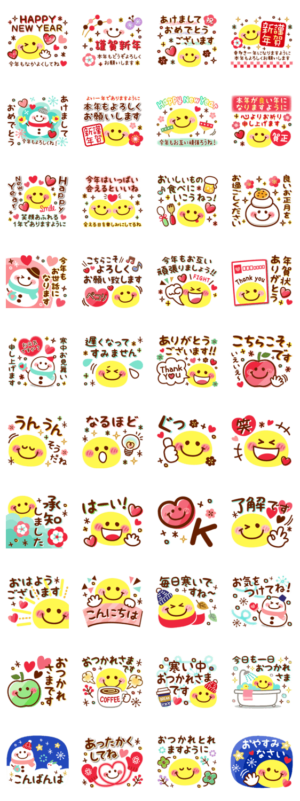 敬語多めの幅広い年齢に使えるスマイル年賀状スタンプ♡日常挨拶も入って毎日にも使えます。HAPPYスマイルで新年もHAPPYに♪