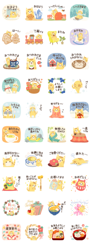 甘さ控えめな大人女子向け茶トラ猫♪毎日のあいさつに使えるシンプルねこスタンプ。冬の気遣い、敬語や挨拶あり。 北欧絵文字と合わせて楽しめます。クリスマス、年末年始