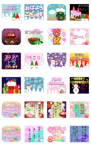 よく使う挨拶や、「Merry christmas」「あけましておめでとう」などの年末年始にも使える、飛び出すスタンプです。サンタや雪だるまなどのキャラ使用。ちゃうちゃう より発売