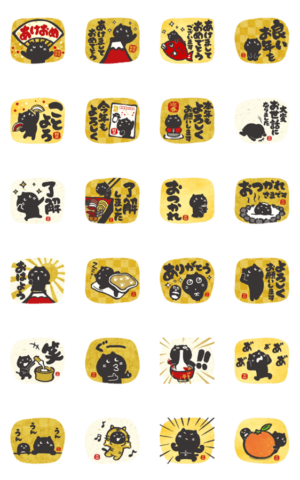 ねこのお正月スタンプです。可愛いですね!24種類ダウンロードできるのは良いですね!