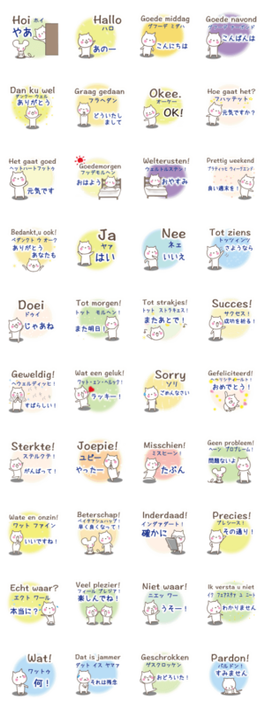日本語とオランダ語で会話ができる。バイリンガルスタンプで世界中がお友達。毎日気軽に使える。外国語LINEスタンプ他多数有。語学研修、海外旅行、留学、ホームステイmanamie より発売