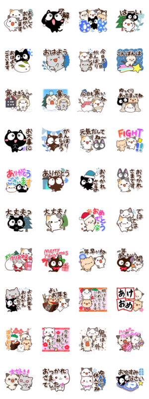 毎年便利に使える、冬の行事の猫スタンプ。『ちびミケ』の三毛猫や、『クロネコすたんぷ』、『やさしいクロネコ』の黒猫等、『かたこ』作成のねこがいっぱい登場します。かたこ より発売