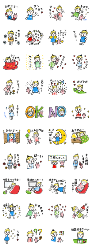 韓ドラやK-POP、韓国好きのお友達とカタカナ韓国語で盛り上がろう♪よく使う日常会話や韓流好きトーク(日本語)もセットになっていて、使いやすいスタンプです。