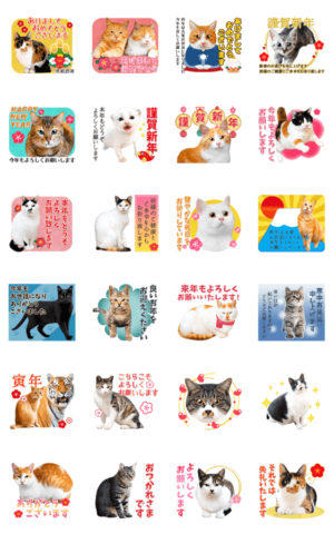 かわいい写真のネコたちが新年のあいさつをお届けします。黒白猫・黒猫・白猫・三毛猫・茶トラ・キジトラなどの画像とイラストの年賀スタンプです。猫好きの上司や同僚に!みけのき より発売