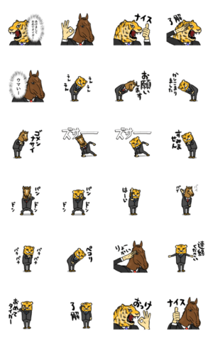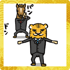 スーツにネクタイの虎と馬の動くスタンプです。顔だけトラやウマのビジネスマンに使える?使いやすいスタンプです。あけおめ要素も少しあります。了解、オッケー、ナイス。