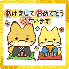 まゆ毛がチャームポイントのまゆきちと、仲良し小ぎつねちゃんの可愛いあけおめスタンプです。
