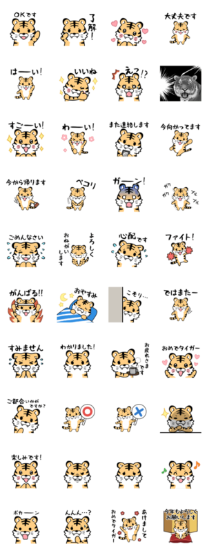 ゆるくて可愛い虎のスタンプです。キュート、リアル顔などバリエーション豊富な表情が揃っています。お正月はもちろん普段使いにも。寅年/年末年始/ダジャレ/シュール/2022