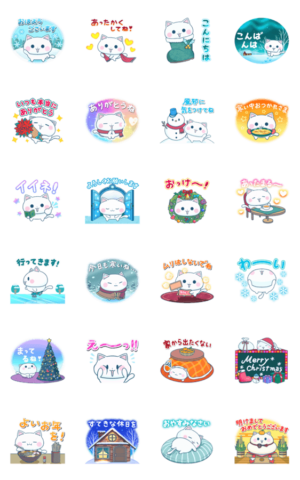 雪のような白猫さんのアニメーションスタンプです。クリスマスとお正月は雪猫さんといっしょに過ごしましょう。すみれぐみ より発売