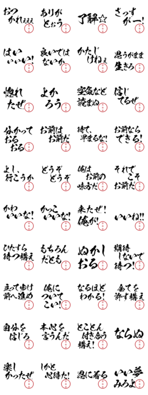 ネタに走ってるのに、達筆のせいか思ったよりかっこいいし、何気に使えるスタンプそろってて使い勝手いいなw