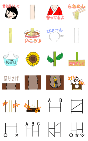 3個で1つの絵になるスタンプです。真ん中のスタンプを連打すれば無限に長く伸ばせます。あみだくじ、モーニングコールetcに使ってください。