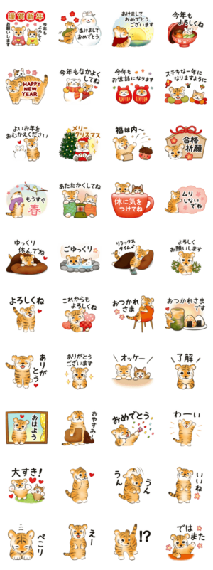 かわいいトラのスタンプです。猫たちもいます♪お正月など、冬に使えるものが多めです。日常で使える挨拶などもセットにしました。(寅年/虎/干支/敬語)erimari より発売