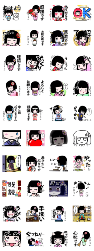『あわびちゃん』用のよく使う言葉を詰め合わせた座敷童子のスタンプです。和服 着物 浴衣かがりひな より発売