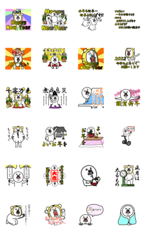 シュールなキャラのお正月スタンプです。良いですね!24種類ダウンロードできるのは良いですね!