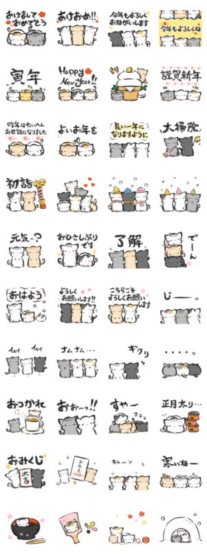墨筆ねこ詰め合わせ!お正月バージョンです。トラ猫、三毛猫、白猫、黒猫、さば、ぶち 茶トラ猫がぎゅっと詰まったスタンプ。年末年始のご挨拶にぜひ。ユナシ より発売