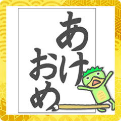 かわいいカッパの毎日つかえる挨拶と返事です。期間限定販売の年末年始の挨拶につかえる、あけましておめでとう、ことよろ、賀正など。毛筆で巨大な習字も書いてます。