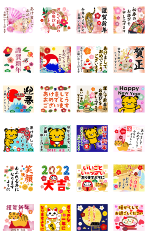 華やかで丁寧な言葉が多めの飛び出す年賀状です。2022年お正月に使える寅のイラストや年号も干支もない毎年使える年賀状まで綺麗めからかわいい系まで使えるセットです♪mtorak より発売