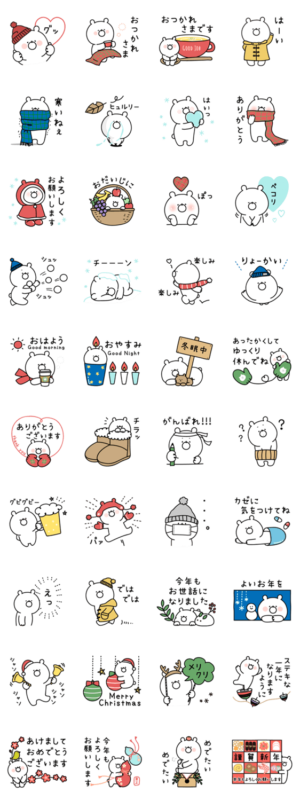 冬仕様のゆるいしろくまさんのスタンプです。日常会話から年末年始のあいさつ、クリスマス、お正月に使えるスタンプ入り。