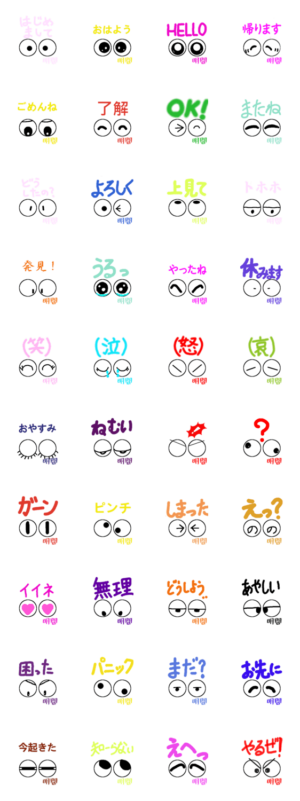 かわいい目玉の日常会話・あいさつ・気持ち 了解 はじめまして おはよう HELLO 帰ります ごめんね またね どうしたの? よろしく 上見て OK トホホ 今起きたあずはふざ より発売