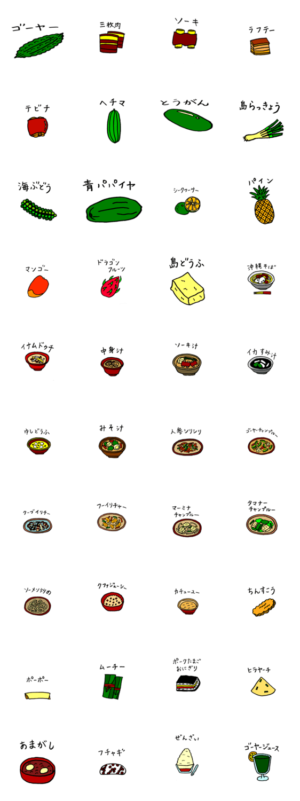 沖縄の一般的な家庭料理と食材のスタンプです。食べたい料理を送ってね!ポムロール より発売