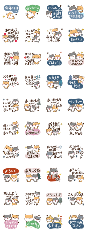 二匹の柴がすごくカワイイです。セリフも軽い挨拶から相手を気遣ったものまであるから使いやすいです。