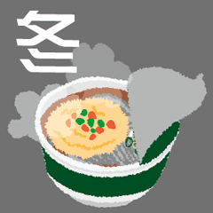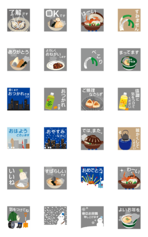 おでんや長ネギ、カップそばが動いたり、雪が降るとメッセージが出ます。年末だけでなく年が明けてからも使える冬のスタンプ。大人の毎日の挨拶にどうぞ。