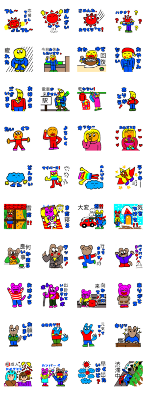 LINEスタンプメーカーでつくったスタンプです。お天気キャラクターと動物達です。冬休みのツブヤキ、アクシデント、成人式、乾杯などおもしろスタンプです。