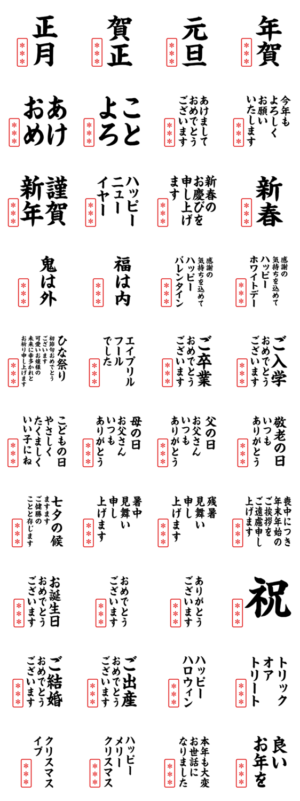 正月/賀正/年賀/あけおめ/節分/バレンタイン/ホワイトデー/卒業/入学/母の日/父の日/七夕/誕生日/結婚/出産/ハロウィン/クリスマス/筆文字/365日/喪中/お名前/あだ名