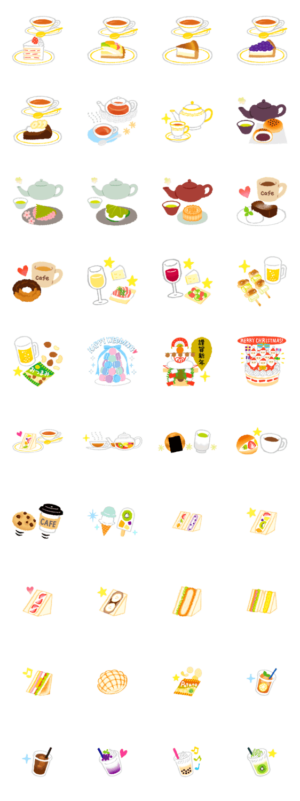 ちょっと一息、お菓子やおつまみでまったり。後半はミニスタンプやスリム(省スペース)タイプです。ケーキセットやティーセット、パンやポテチ、マリトッツォもあるよ。Y.Toyama より発売