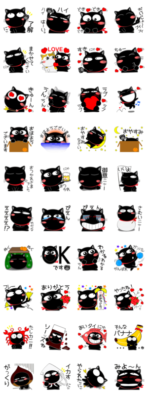 黒猫のスタンプ。バレンタインだ、気持ちを伝えよう。ダジャレも敬語も毎日よく使う言葉もたくさん。主線が少な目のほんわか絵。三毛猫スタンプとセットでどうぞ。urajo より発売